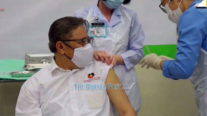 KUCHING, Feb 26 — Chief Minister Datuk Patinggi Abang Johari Openg today received his first Covid-19 vaccine dose at the Petra Jaya health clinic here, spearheading the first phase of the Sarawak Covid-19 vaccination programme.