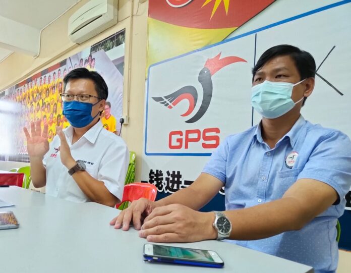 Chieng (left) stresses a point during the press conference. With him is SUPP Bukit Assek Youth vice chief Councillor Phuang Ton Hing. – Picture by Peter Boon/Borneo Post