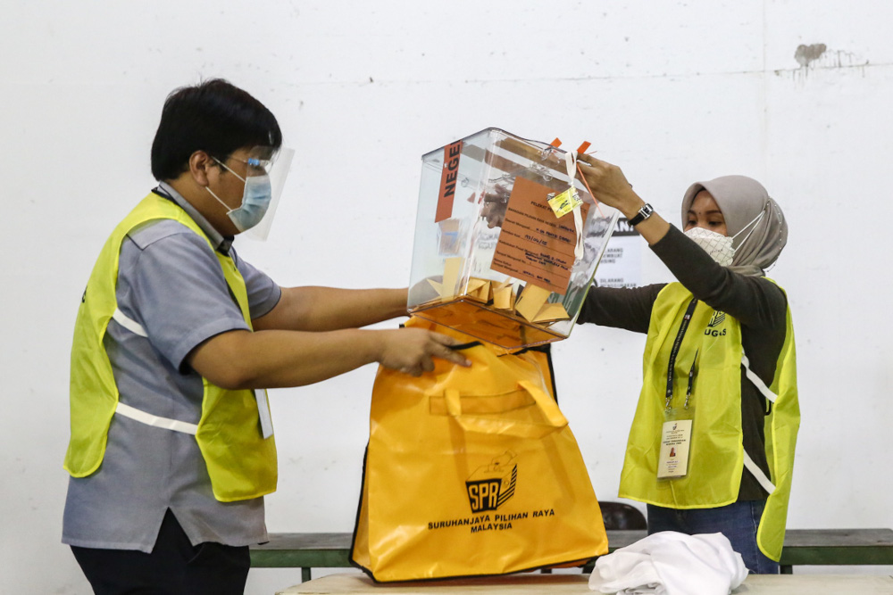 Election Commission (EC) personnel seal ballot box after polls closed during early voting at Dewan Badminton Kompleks Perumahan Polis Tabuan Jaya in Kuching December 14, 2021. — Picture by Yusof Mat Isa