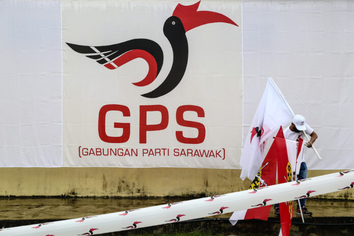 A Gabungan Parti Sarawak (GPS) campaigner putting up flags ahead of nomination day in Gedong, Sarawak December 5, 2021. — Picture by Yusof Mat Isa