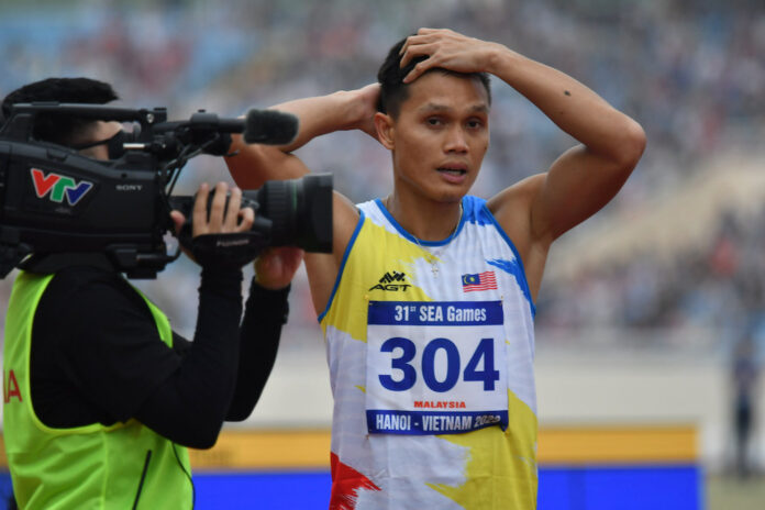Jonathan Nyepa reacts after coming in sixth in the 200 m sprints at the 31st SEA Games in Hanoi May 14, 2022. — Bernama pic