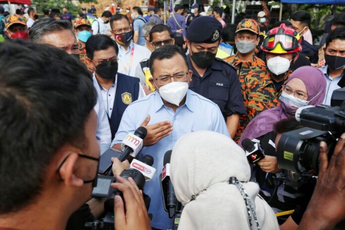 Selangor Menteri Besar Datuk Seri Amirudin Shari speaks to reporters during a visit to the site of a landslide at Taman Bukit Permai 2, Ampang March 11, 2022. — Picture by Choo Choy May