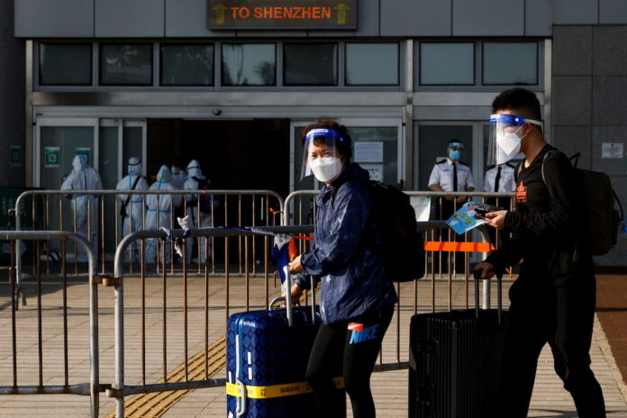 Travellers wearing face mask and shield, walk at the China-Hong Kong border of Shenzhen Bay Port, during the Covid-19 pandemic in Hong Kong, China March 14, 2022. — Reuters pic