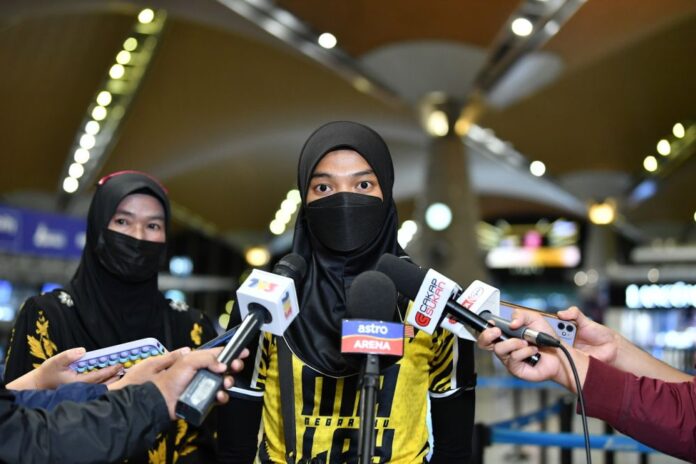 Cyclist Siti Nur Alia Mansor speaks to reporters before departing for Spain at the Kuala Lumpur International Airport in Sepang January 12, 2022. — Bernama pic