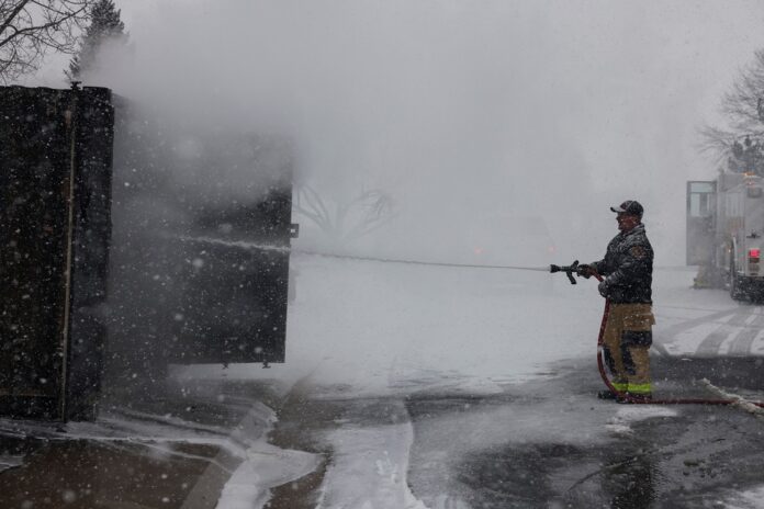 Jeff Held from the Westminster Fire Department puts out a fire in a shipping container that had been filled with storage items from the home that used to be there in Louisville, Colorado December 31, 2021. – Reuters pic