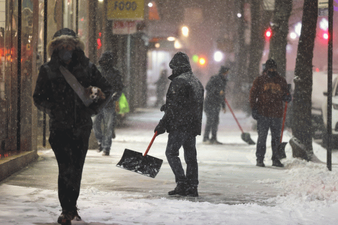 People shovel snow off the sidewalk in the Flatbush neighbourhood of Brooklyn in New York City. — AFP photo