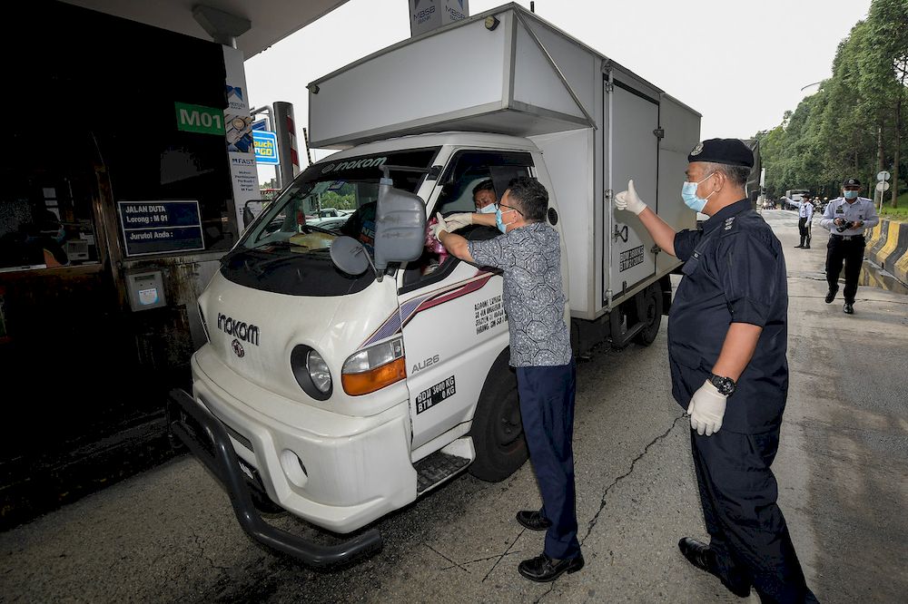 Deputy Minister of National Unity Datuk Seri Ti Lian Ker presenting a pack of lambuk porridge to a driver passing through the highway at the Jalan Duta Toll Plaza in Kuala Lumpur, April 28, 2021. Also present was the Head of the Royal Malaysia Police Traffic Investigation and Enforcement Department, ACP Zulkefly Yahya. — Bernama pic