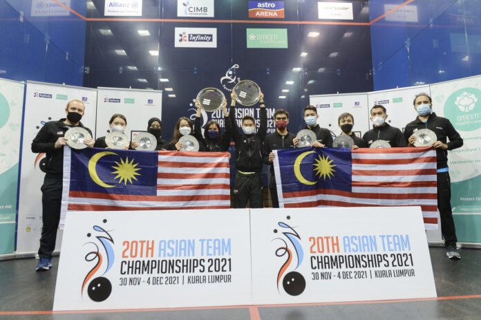The national squash team won first place in the Women’s and Men’s categories in the final of the 2021 Asian Team Squash Championship at the Bukit Jalil National Squash Centre, December 4, 2021. — Bernama pic