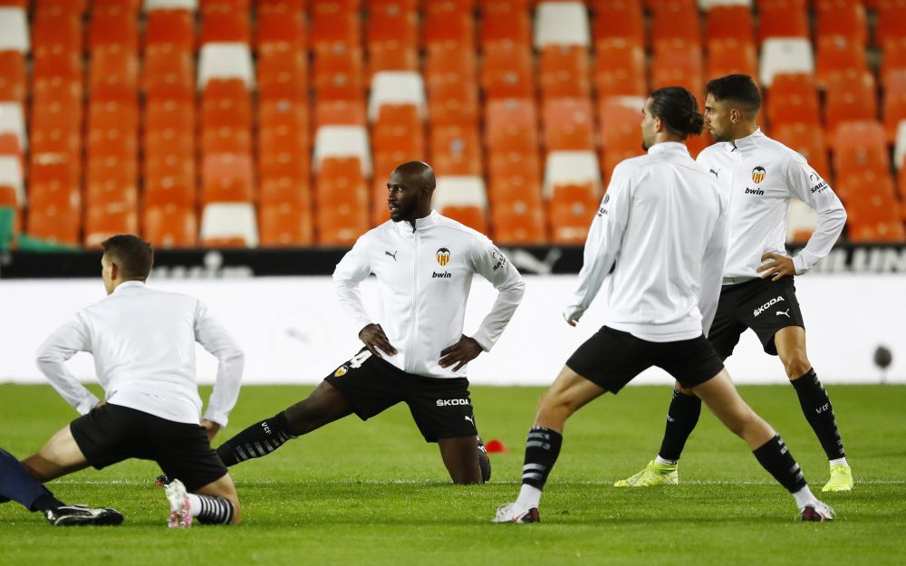 Valencia’s Eliaquim Mangala (centre) and teammates warm up before the match against Real Madrid at the Mestalla, Valencia November 8, 2020. — Reuters pic