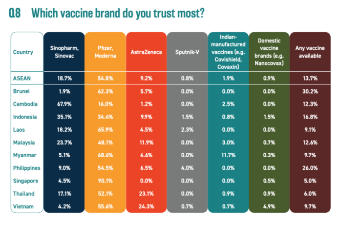 Regionally, Pfizer and Moderna together gained the most trust from more than half of the Asean population (54.8 per cent) compared to Sinopharm or Sinovac at 18.7 per cent.