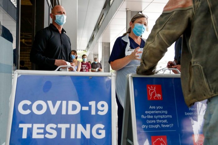 Staff question people as they wait in a line at a Covid-19 testing station in Sydney last week. (AP pic)