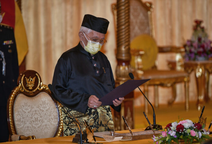 Tun Abdul Taib Mahmud takes his oath of office as Yang di-Pertua Negeri of Sarawak for the third term at the Dewan Lapau of the State Assembly Building in Kuching, March 1, 2022. – Bernama pic