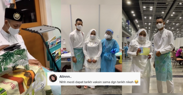 Apa yang menarik perhatian adalah apabila pasangan tersebut mendapat tarikh temu janji vaksin sama dengan tarikh akad nikah. Tanpa fikir panjang, pasangan itu bergegas pergi ke PPV dengan memakai baju nikah untuk hadir temu janji vaksin sebelum majlis nikahnya.
