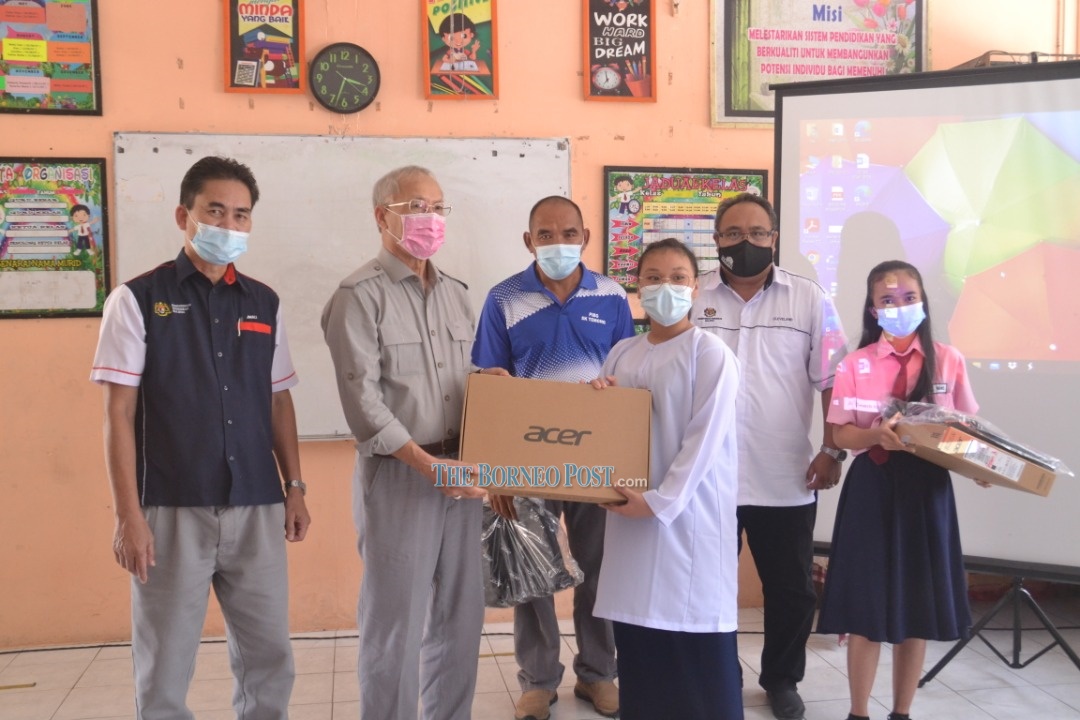 Richard (second left) presenting the laptops to Nabiatul and Macgres (right), while (from left) Jimali, Bujang (third left) and Cleveland (second right) looks on.