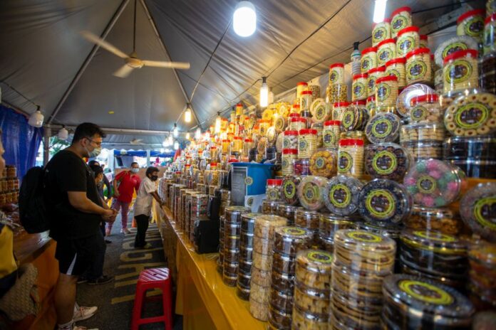 People shop for biscuits and cookies on Jalan Tunku Abdul Rahman ahead of Hari Raya celebrations April 24, 2022. — Picture by Devan Manuel