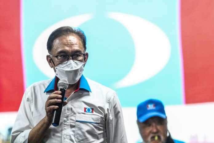 PKR president Datuk Seri Anwar Ibrahim giving his speech at the DUN N27 at the PKR Operations Room in Bandar Layang-Layang, Simpang Renggam, Johor March 3, 2022. – Picture by Hari Anggara