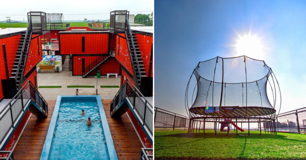 Head atop one of the metal containers and jump your heart out on their ginormous trampoline, all with the picturesque view of the surrounding greenery.