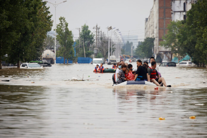 Video footage published by the Shanxi Evening News showed rescuers wading through murky waters and floating on rafts down flooded urban streets.