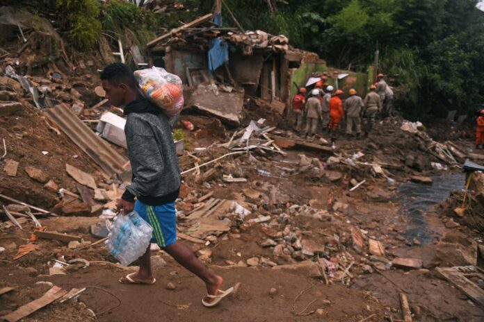 A man holds donations as he passes by the zone of a giant landslide at Caxambu neighbourhood in Petropolis, Brazil, on February 19, 2022. A total of 136 bodies have been retrieved to date, according to civil defence officials. — AFP pic