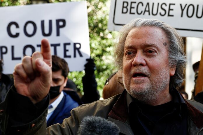Before surrendering to the FBI, Bannon told reporters, “We’re taking down the Biden regime,” though he did not specify what he meant by “taking down.” A demonstrator standing behind him held a sign that read “Coup Plotter.”