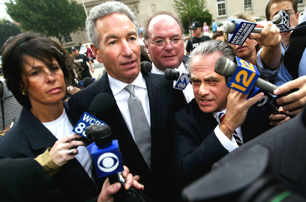 Kushner (centre) wades though the media with his wife and legal team to the US District Courthouse in Newark, New Jersey. — AFP file photo