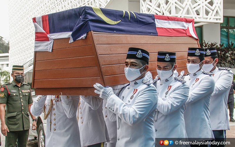 The casket containing the remains of Tun Rahah Mohamed Noah being brought to Masjid Negara to be buried at the Heroes’ Mausoleum today.
