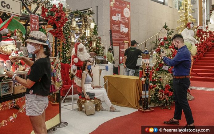 A woman posing with Santa, who stands behind a glass barrier, at a shopping centre in Kuala Lumpur. Prime Minister Muhyiddin Yassin advises those receiving visitors to follow all SOPs to prevent Covid-19.