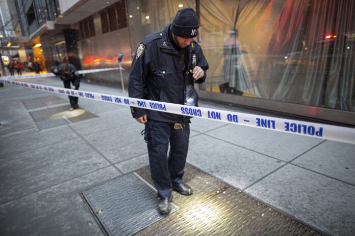 A New York City police officer looks on the ground next to the entrance of the Museum of Modern Art in New York City on March 12, 2022. Two people were stabbed at New York’s prestigious Museum of Modern Art on Saturday, police said, causing the museum to be evacuated. — AFP pic