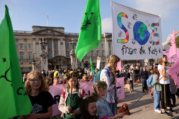 School students and parents carry placards as they gather in order to hand over a 100,000-signature petition urging the Royal Family to rewild their land, outside Buckingham Palace in central London on October 9, 2021, ahead of the Cop26 climate talks. ?