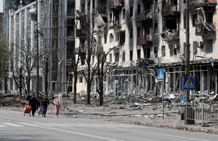 People walk along a street near a building damaged during Ukraine-Russia conflict in the southern port city of Mariupol, Ukraine April 25, 2022. — Reuters pic