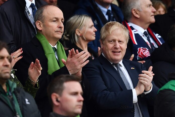 Britain’s Prime Minister Boris Johnson (right) and Ireland’s Prime Minister Micheal Martin wait for the start of the Six Nations international rugby union match between England and Ireland at Twickenham Stadium, London, March 12, 2022. — AFP pic
