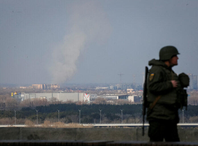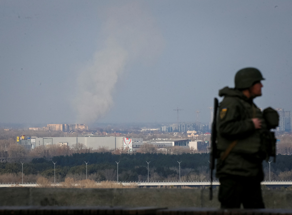 A serviceman of Ukrainian National Guard guards in central Kyiv as smoke rises in the distance February 25, 2022. — Reuters pic