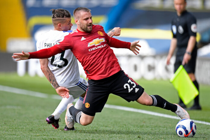 Manchester United defender Luke Shaw vies with Leeds United midfielder Kalvin Phillips during the English Premier League football match in Leeds, northern England April 25, 2021. — AFP pic