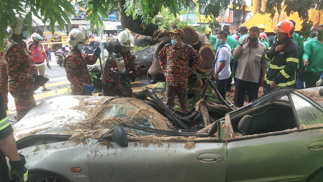 The giant Angsana tree at Perak Road fell over and crushed a car driving by at about 9.30am April 27, 2021.