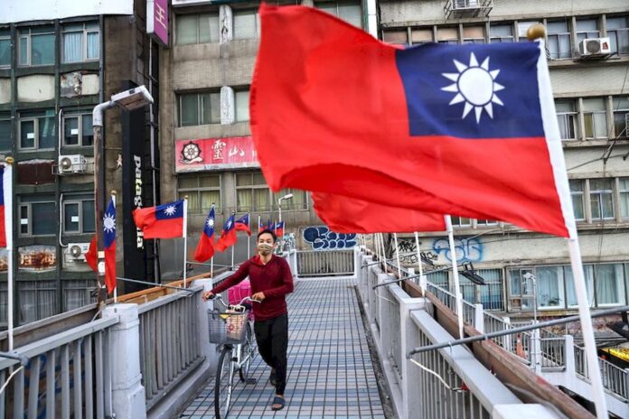 A man walks on an overpass decorated with Taiwan flags to celebrate the upcoming National Day in Taipei, Taiwan, October 7, 2021. –Reuters pic