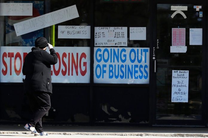 A woman looks at signs at a store in Illinois in May. Covid-19 has led to closure of businesses across America. (AP pic)