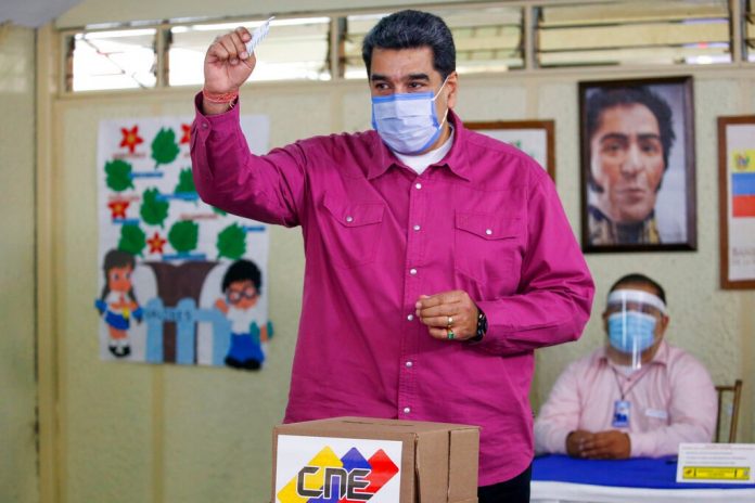 Venezuela has been hard-hit by the Covid-19 pandemic, and voters were required to wear masks inside polling stations, where the floors bore markings to ensure social distancing was maintained.