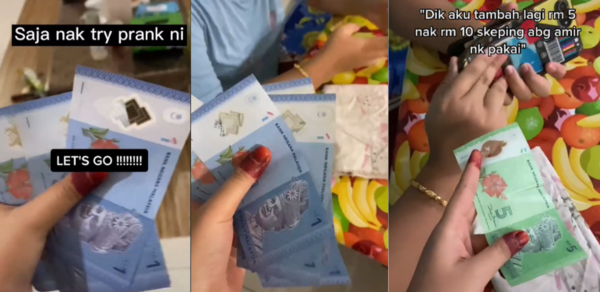 Tetapi, selepas si kakak dapat duit RM5 sekeping itu, dia kembali kepada adiknya dan memberitahu untuk menukarkan kepada RM10 dengan alasan abang mereka mahukannya.
