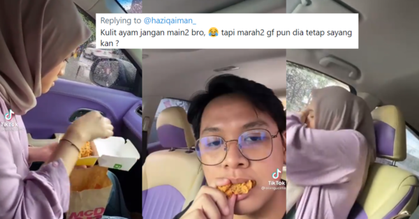 Sama seperti video yang tular di Twitter baru-baru ini apabila seorang lelaki mencuri kulit ayam goreng teman wanitanya secara senyap-senyap mencuri tumpuan ramai.