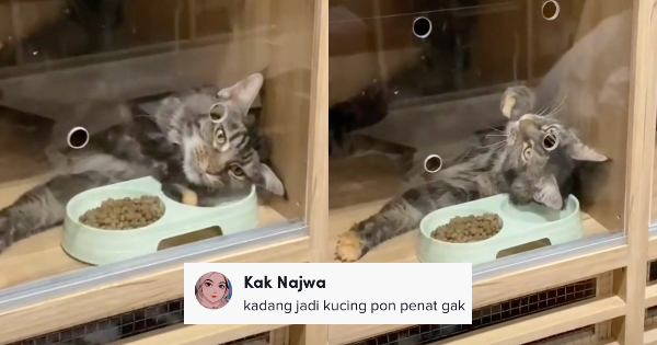 Menerusi video yang dimuat naik oleh @ziey_hann di TikTok, kelihatan seekor kucing sedang berbaring sambil kepalanya diletakkan di atas bekas makanan dan minuman kucing.