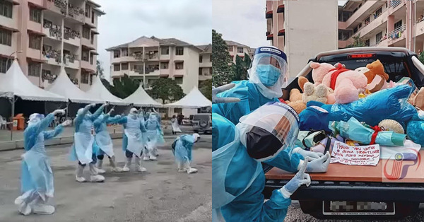 In the videos, residents were seen dropping gifts from their balconies as the frontliners in full personal protective equipment picked them up from the ground floor.
