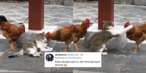 Dua ekor ayam itu dikatakan sengaja mematuk kucing tersebut dan akhirnya menimbulkan dekah ramai apabila kucing itu mula membalas dendam.