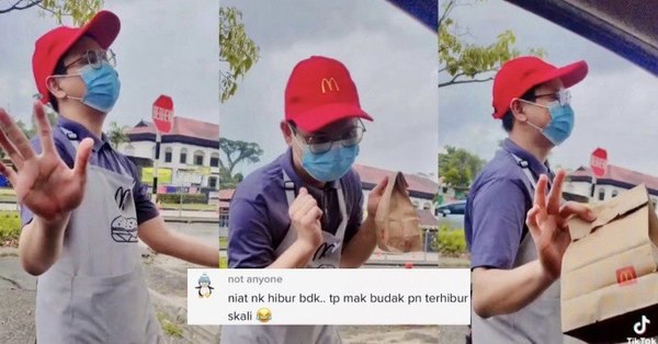 Secara tak langsung, dia berjaya menghiburkan kanak-kanak perempuan itu dan ibunya dilihat ketawa besar kerana terhibur dengan gelagat pekerja McD berkenaan.