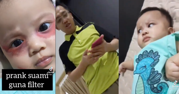 Sama seperti video yang tular di Twitter ini apabila si isteri cuba menyakat suami dengan prank filter sehingga nampak mata anak mereka seperti bengkak dan lebam.