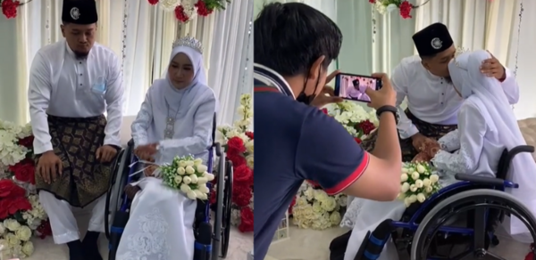 Menerusi video tersebut, kelihatan lelaki itu mengucup dahi isterinya yang sedang duduk di atas kerusi roda oleh kerana lumpuh sebelum memakaikan gelang tangan selepas mereka berdua sah menjadi suami isteri.