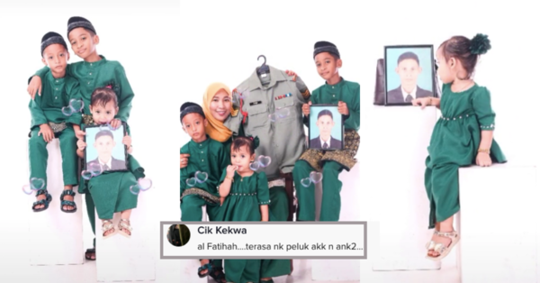 Apa yang lebih menarik perhatian ramai adalah apabila dia membawa anak-anaknya untuk bergambar di studio. Malah, tidak dilupakan potret dan baju seragam sang suami yang dipegang oleh anak mereka semasa penggambaran dilakukan.