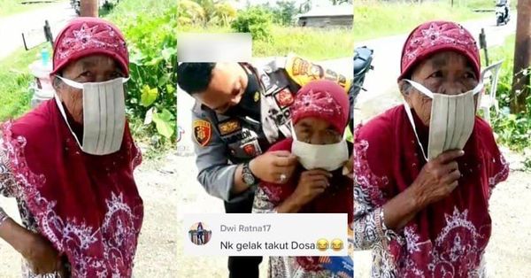 Namun, salah seorang daripada anggota polis itu bertindak membetulkan semula posisi mask nenek tersebut yang diam seribu bahasa apabila ditanya dari mana dia mendapat mask itu.