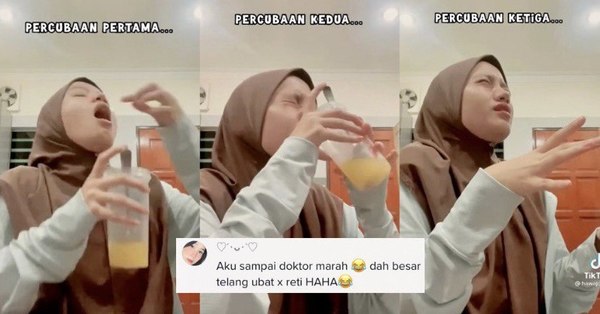 Malah, dia juga dilihat menelan ubatnya dengan meminum air Sunquick. Pada akhir video, setelah tiga kali percubaan akhirnya gadis itu berjaya menelan ubatnya dan dia seolah-olah merasa lega.
