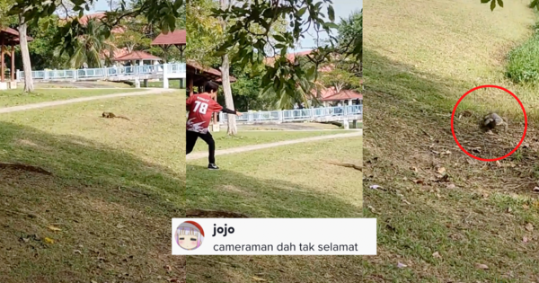Namun, salah seorangnya telah menjumpai seekor biawak dan cuba untuk mengusiknya. Apa yang lebih menarik perhatian adalah biawak berkenaan tiba-tiba saja berlari ke arah si perakam membuatkan dia panik.