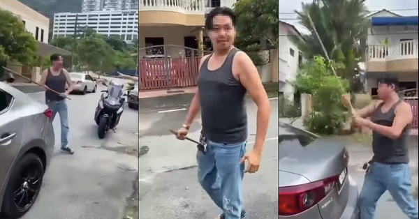 The one minute and 40-second long video shows the man first charging at the woman and the men, and then using the stick to repeatedly hit a parked car’s boot and damage the rear windshield.